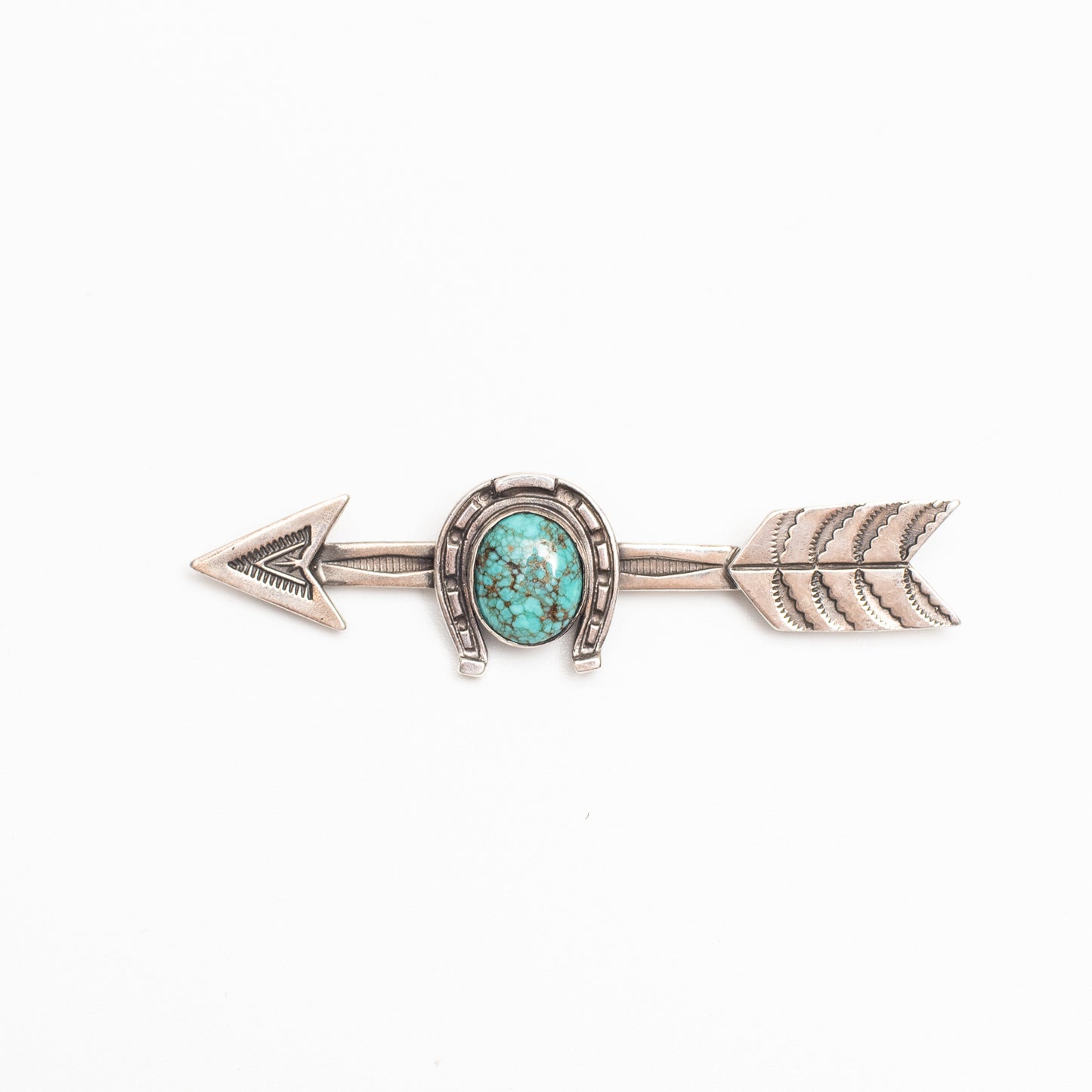 All of our favorite things in one pin….A sterling silver stamped arrow with a centered horseshoe set with an oval turquoise stone. All sterling with a traditional pin back so you can wear this on your favorite hat, jacket or bag.