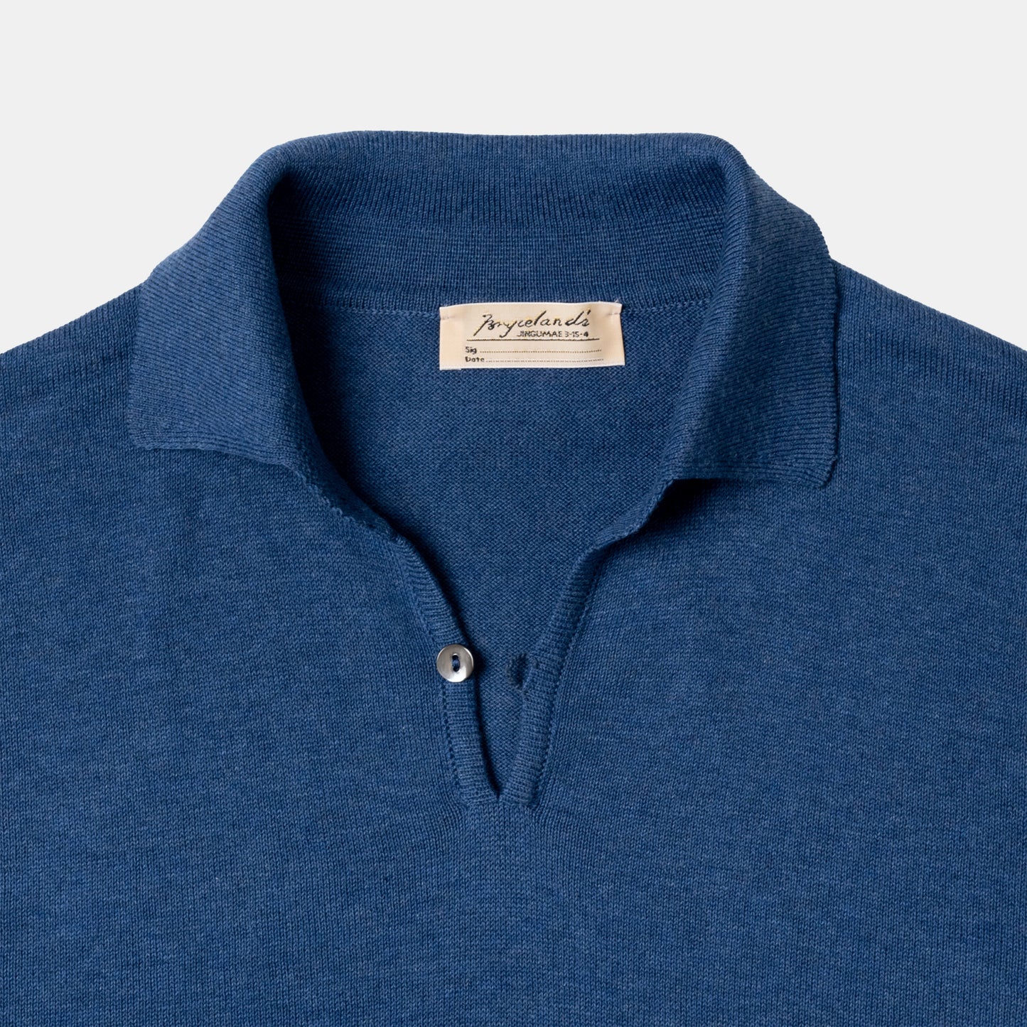 Our Skipper polo, a take on a classic knit polo, is a tennis shirt for cream flannels and white bucks - it's louche and elegant and intentional. It is short so it can ride on the waistband of our trousers, ribbed at the shorter, mid-bicep sleeve - regardless of how well trained those biceps are, we aren’t trying to mask them or disappear into the wallpaper.