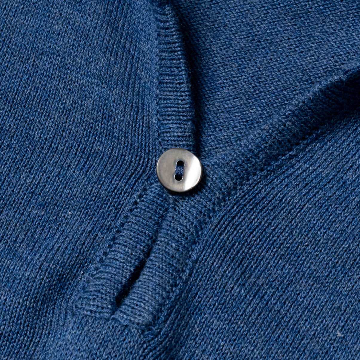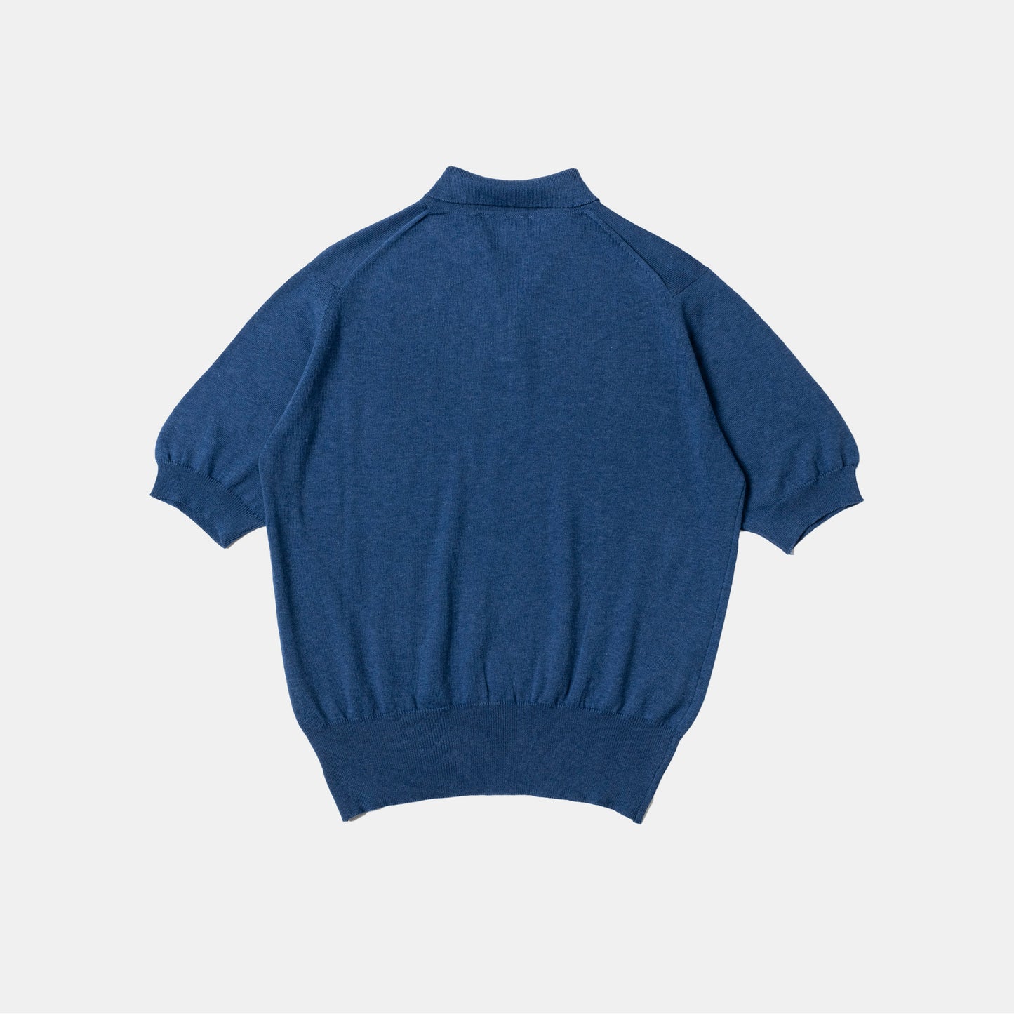 The collar sits above a short woven placket, with a single cats-eye mother-of-pearl button and loop. The knit of the cotton is soft and draped and lush, in shades elegantly mottled rather than a flat, neon sign primary. While they are woven in Scotland, they are born for elegant summer days - with a hank at the neck and bloused short over a pair of wide-leg flannels, it's Cary Grant in To Catch a Thief.