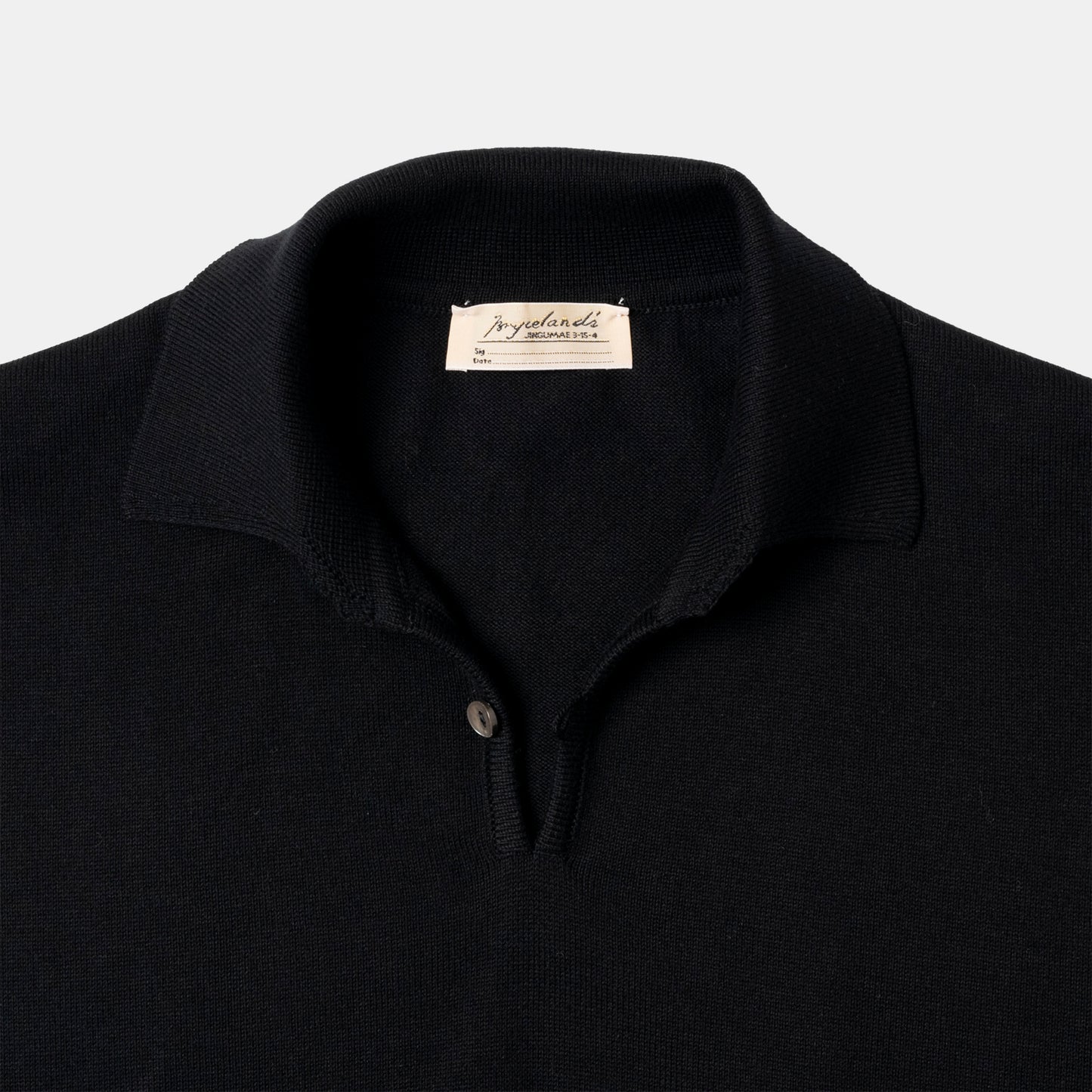 The collar sits above a short woven placket, with a single cats-eye mother-of-pearl button and loop. The knit of the cotton is soft and draped and lush, in shades elegantly mottled rather than a flat, neon sign primary. While they are woven in Scotland, they are born for elegant summer days - with a hank at the neck and bloused short over a pair of wide-leg flannels, it's Cary Grant in To Catch a Thief.