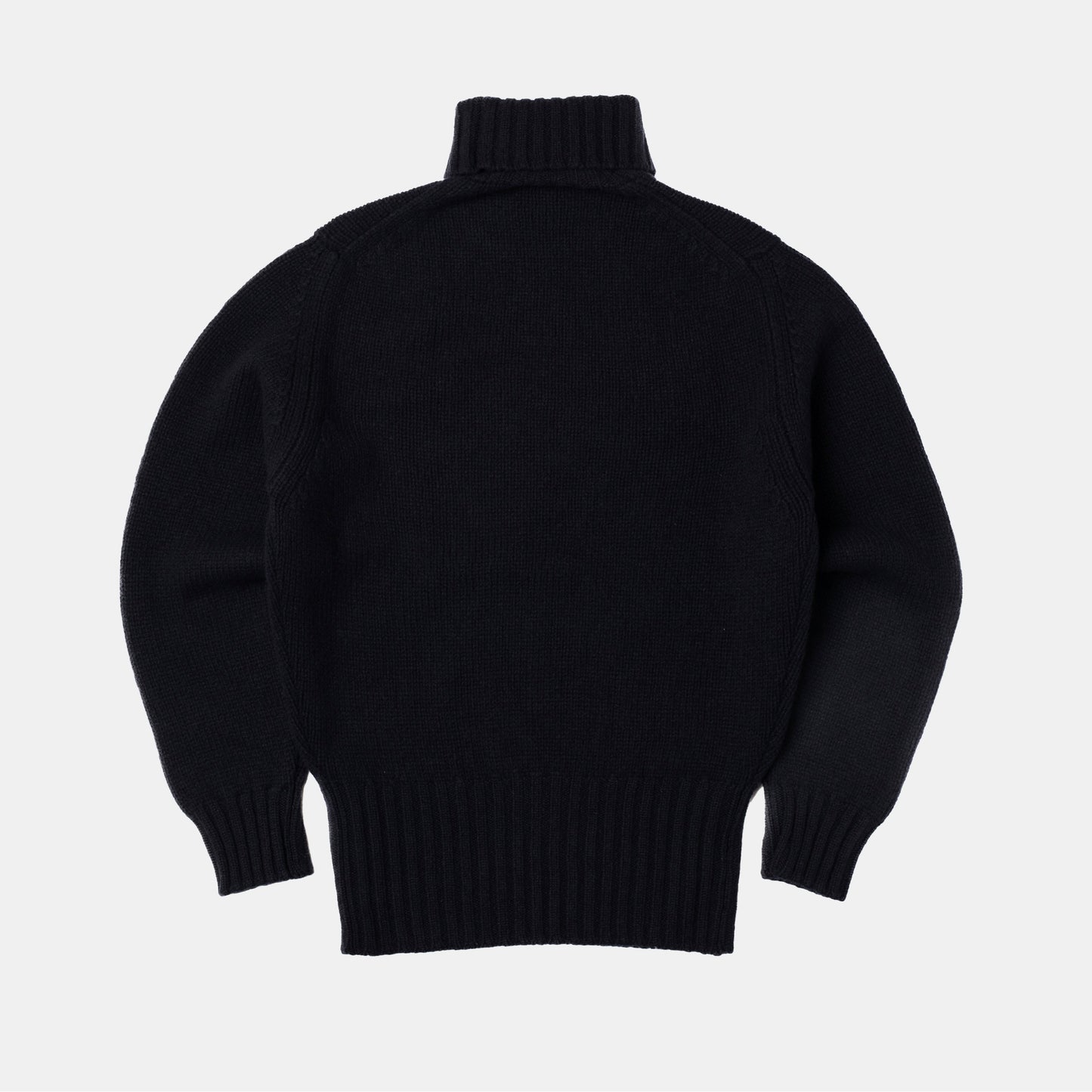 Our ‘RAF’ roll-neck is produced in Scotland to our house pattern; inspired by the knitwear issued to British sailors and airmen during WWII, refined to work proportionally with a tailored wardrobe, as well as more causal items.