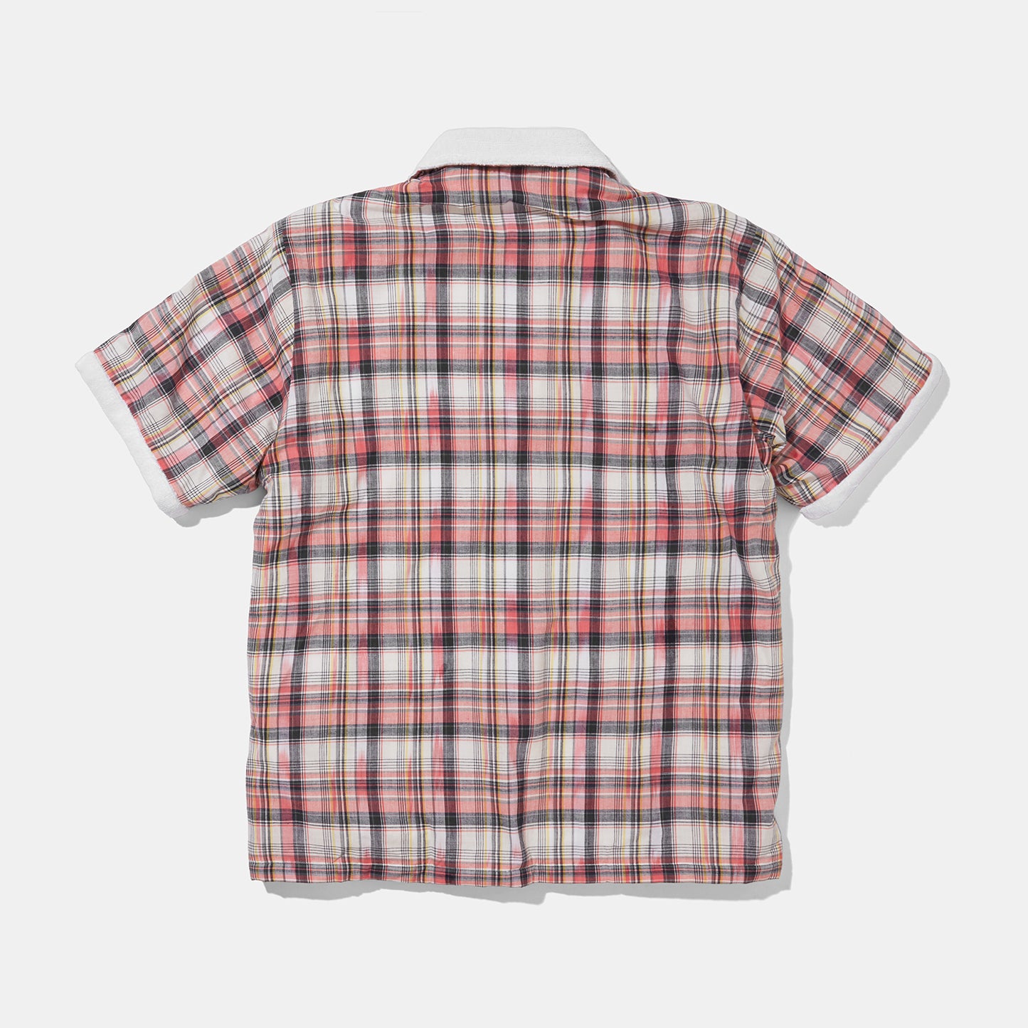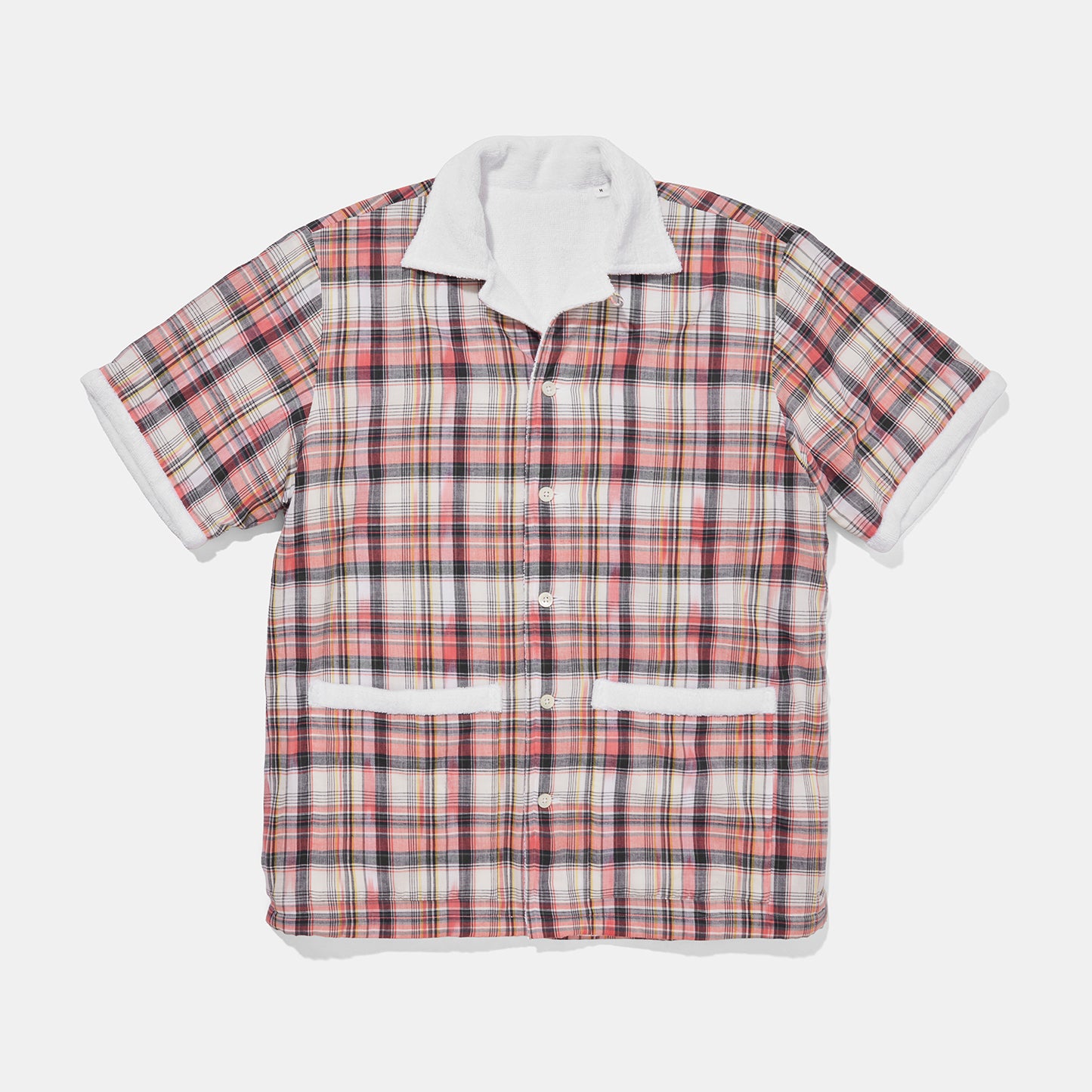 A layering piece meant to be thrown on after a dip in the pool, our towel shirt is a layer of towelling to keep the wearer dry in the heat of summer. Cut like a box shirt, with two patch pockets, short box sleeves and a short camp collar, the face layer is made from a selection of vintage French voile cottons, giving a little glamour to the 60’s vibes.