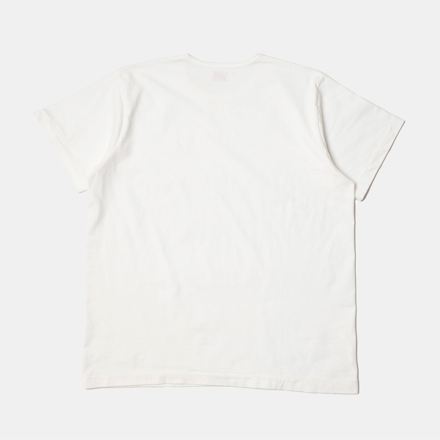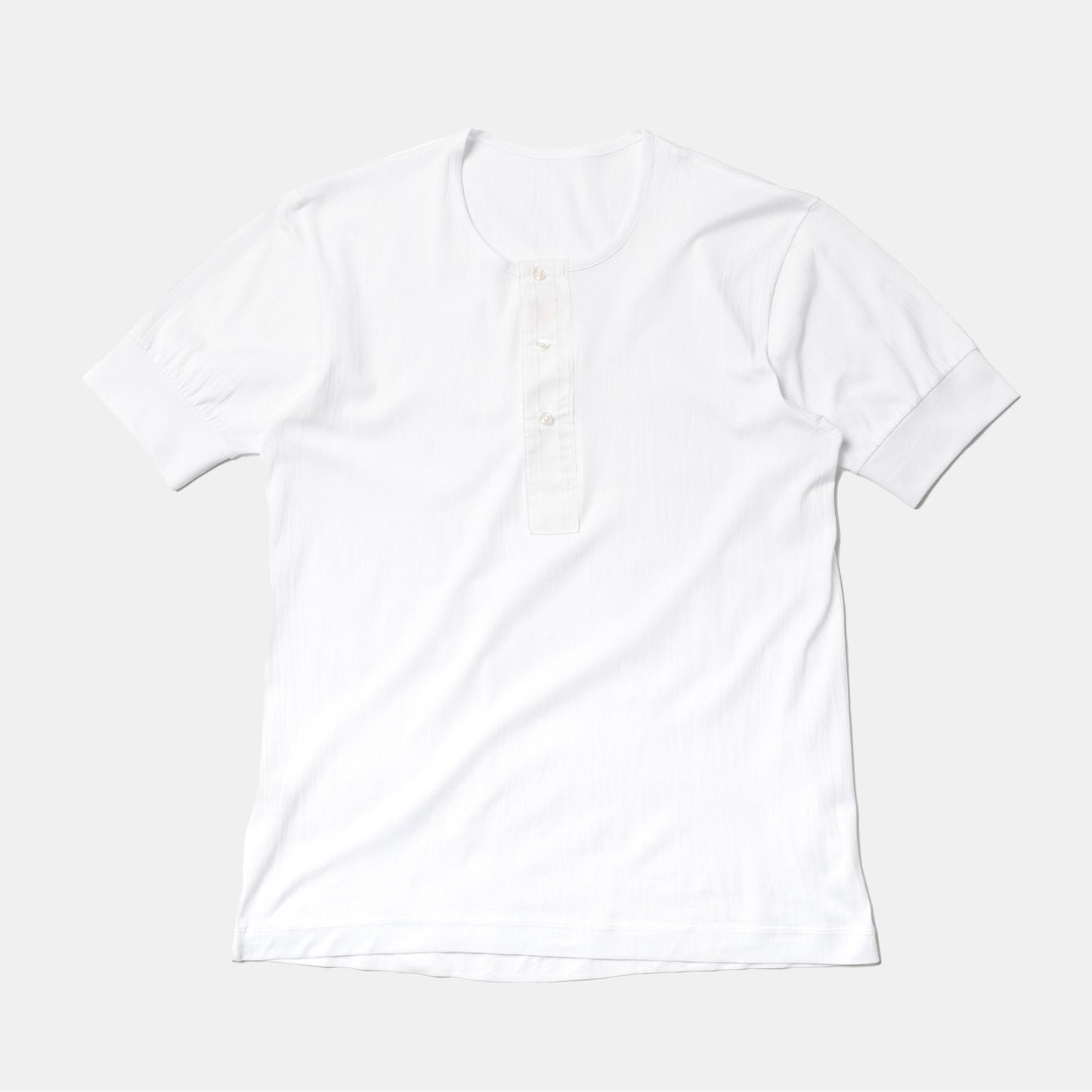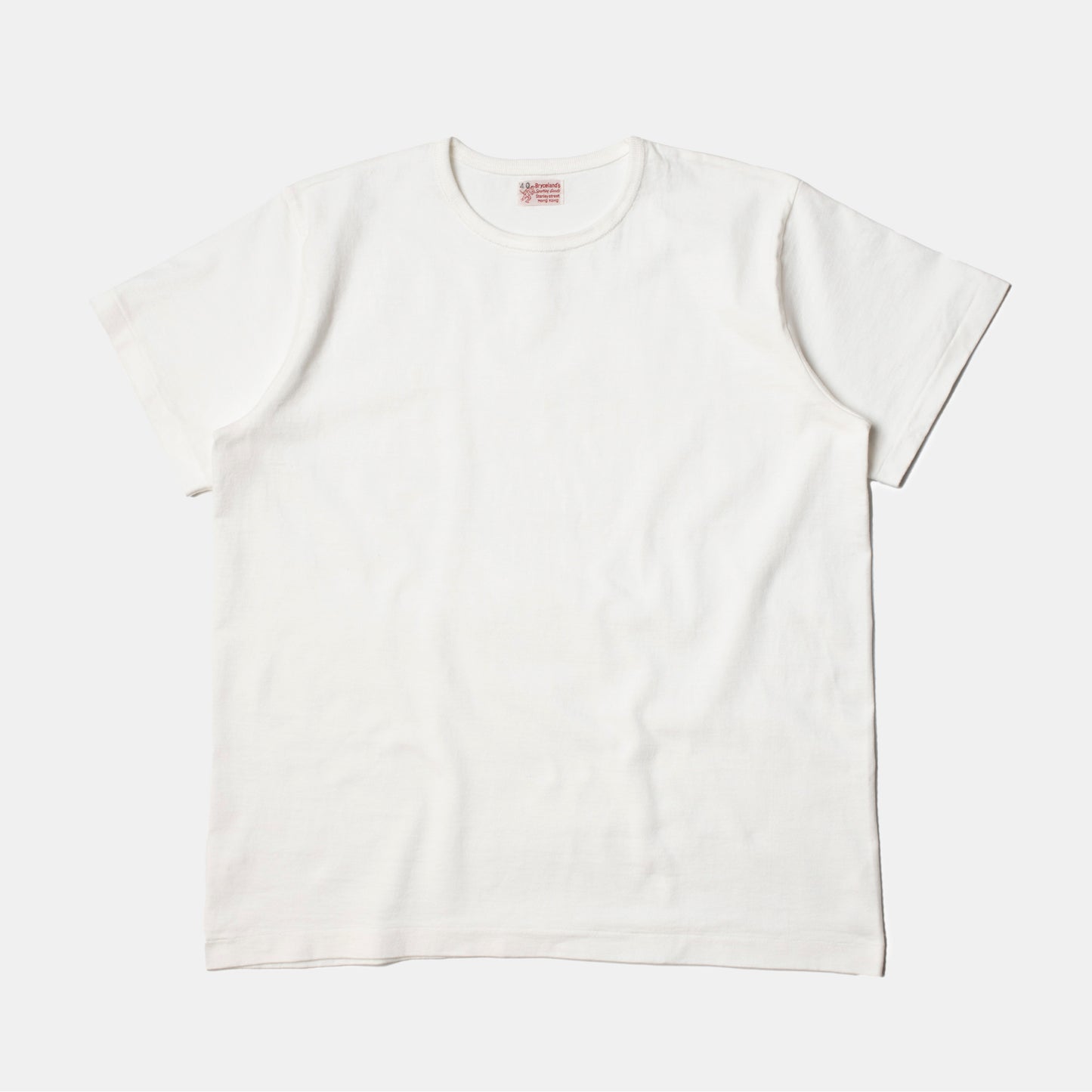 Ours is based on those earliest of undershirts, initially made for the US Army with tubular knitted body, high-arm holes, slightly wider tapped crew neck, and short-stubby sleeves.