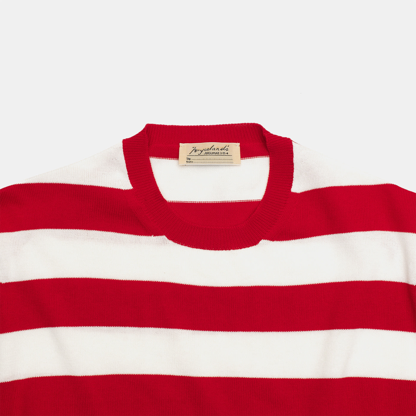 In horizontal block stripes of red and white or blue and white, it references Breton sweaters and 50’s greasers - playful and bold.