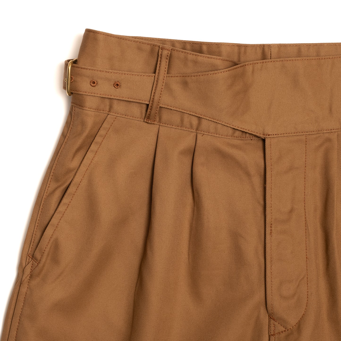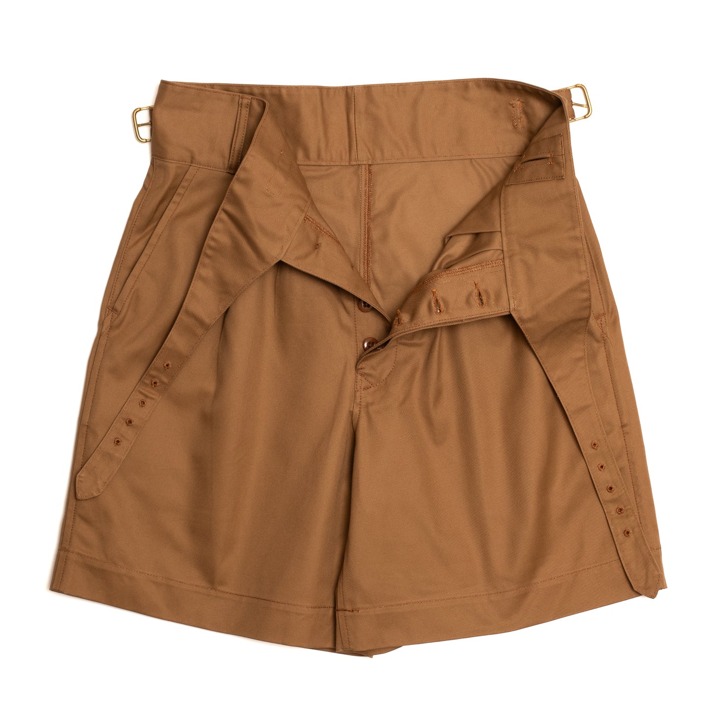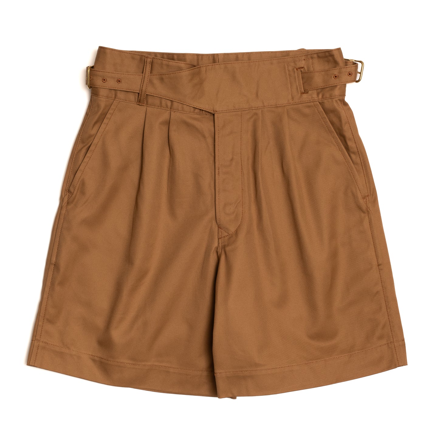 As reminiscent of 1940’s resort wear as it is steadfast British military garb, the high waisted and deep pleated form of the Gurkha short is breezy and louche, a juxtaposition of it’s almost feminine silhouette with its robust cloth and heritage. Ours are cut high, with the classic side fastening self belt waist, double pleats on the front and single pleats at back, and a wide leg that falls just past the knee without a turn up. Made in Japan from a heavy cotton twill, they are as hardy as their military past, and soften with each wash and wear to become a slouchy, draped garment to tackle the summer heat.