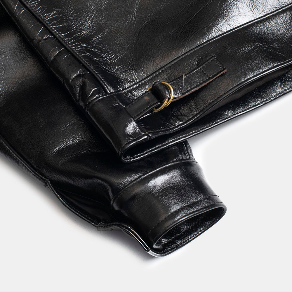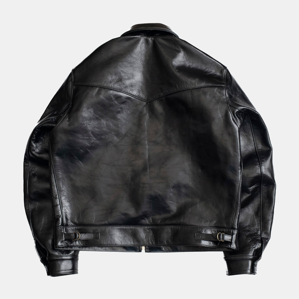 A double rider style with asymmetric zip, “D” style pistol pocket and classic action back, we have taken the classic style and played with the proportions. Our model is slightly longer, but wider and shorter. Made in black horsehide with a custom red and black check wool lining.