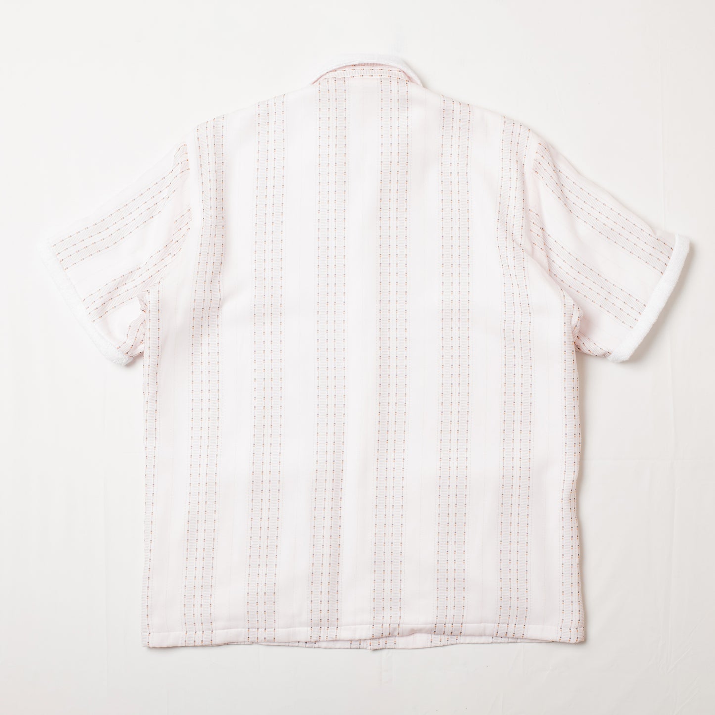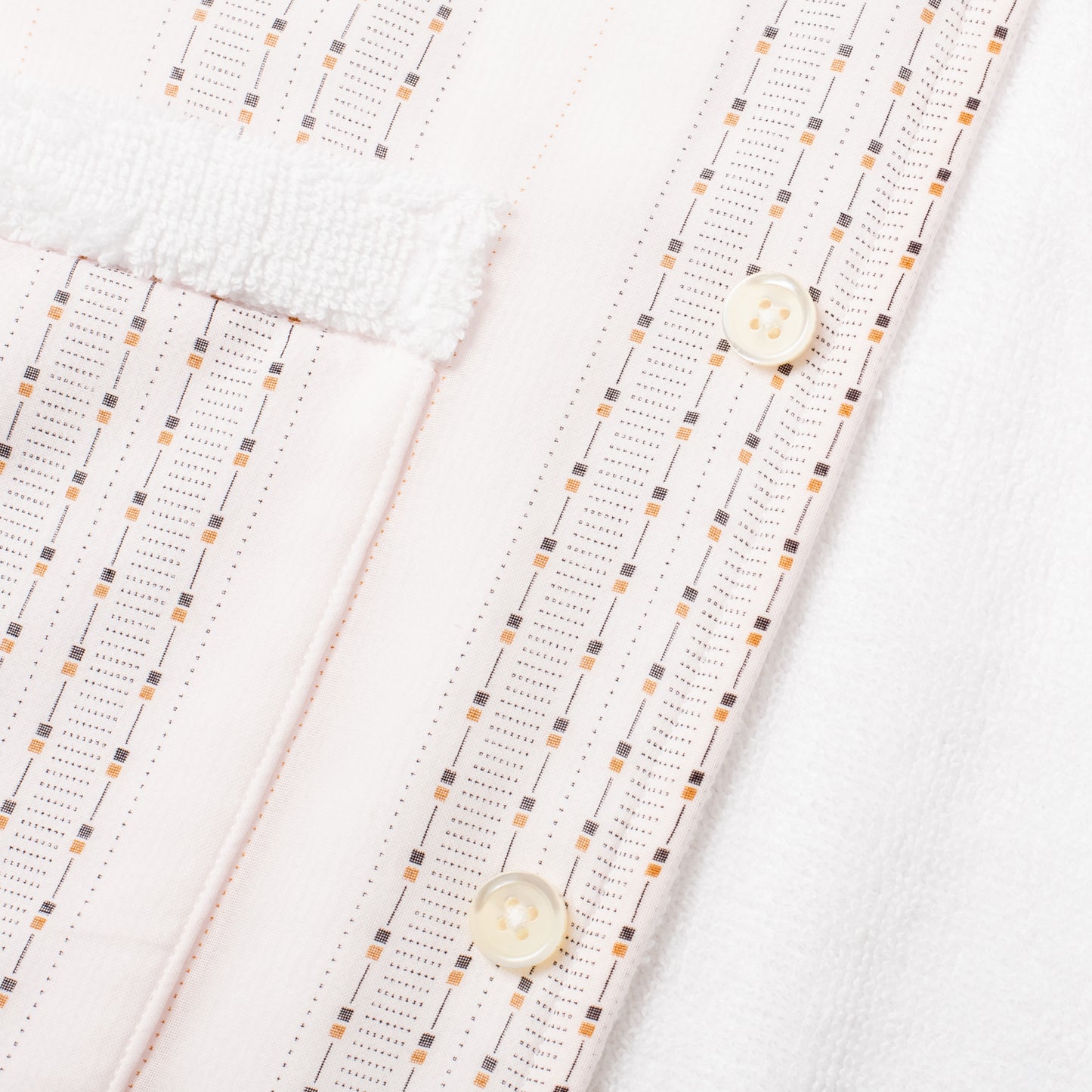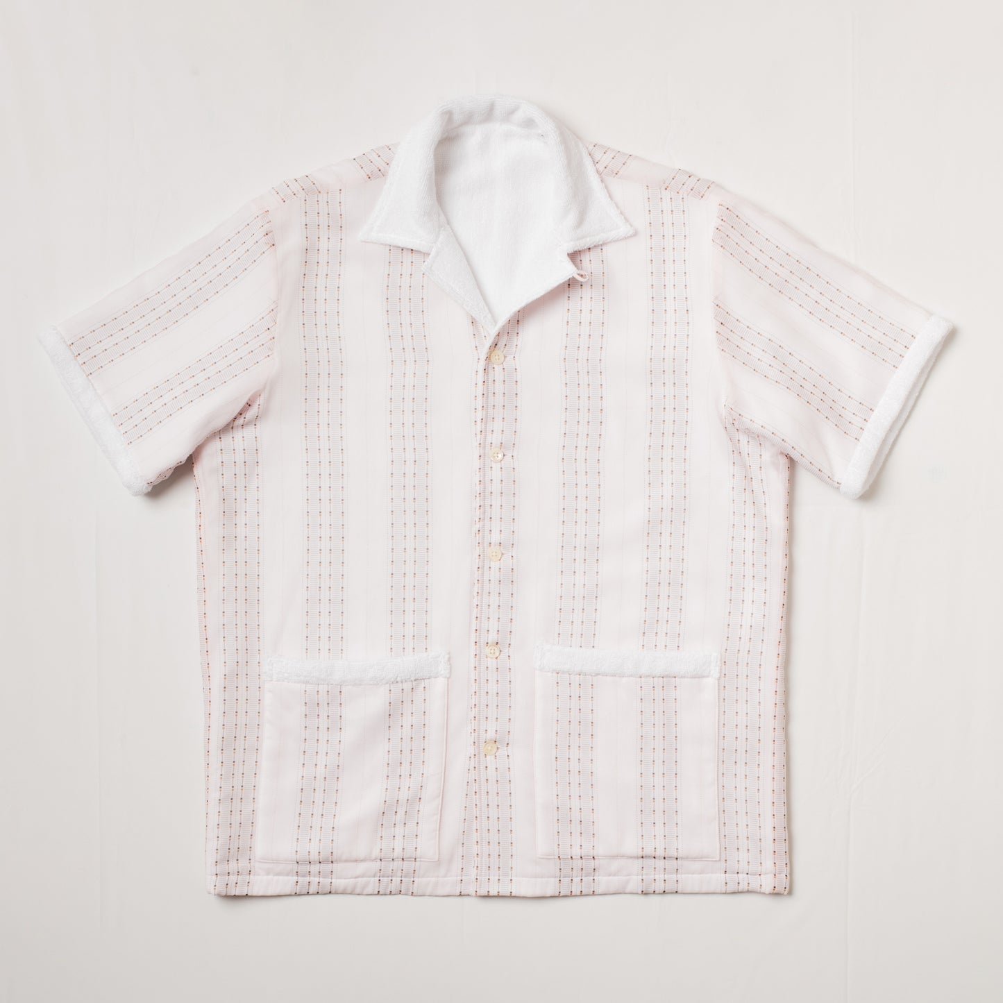 A layering piece meant to be thrown on after a dip in the pool, our towel shirt is a layer of towelling to keep the wearer dry in the heat of summer. Cut like a box shirt, with two patch pockets, short box sleeves and a short camp collar, the face layer is made from a selection of vintage French voile cottons, giving a little glamour to the 60’s vibes.