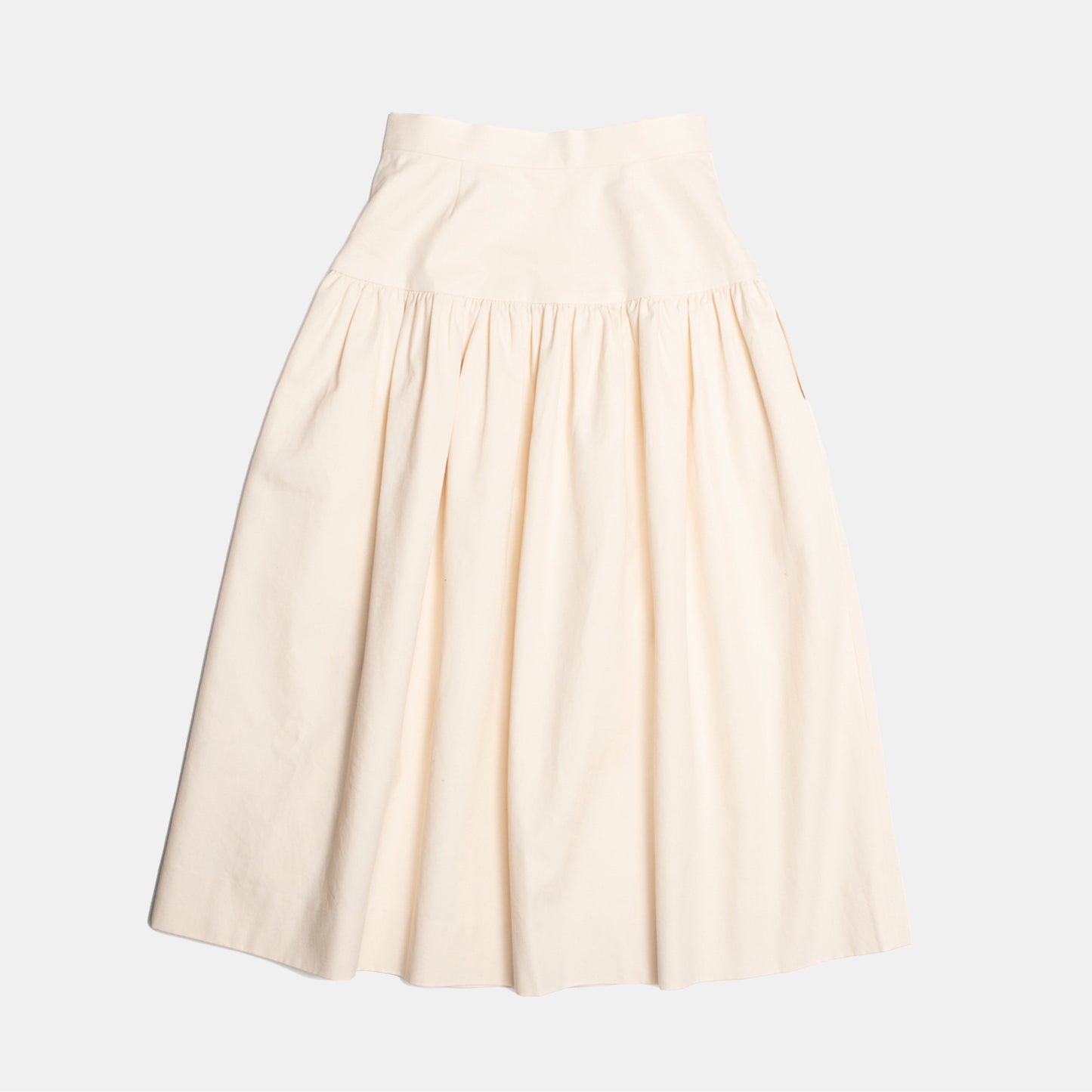 Inspired by the 1940s western-wear, the vintage-pattern-based rodeo skirt is made with a fitted waistband, a buttoned front closure and in-seam side pockets. It fits snug through the hips; gathered to a shaped yoke and flares out to midi length.